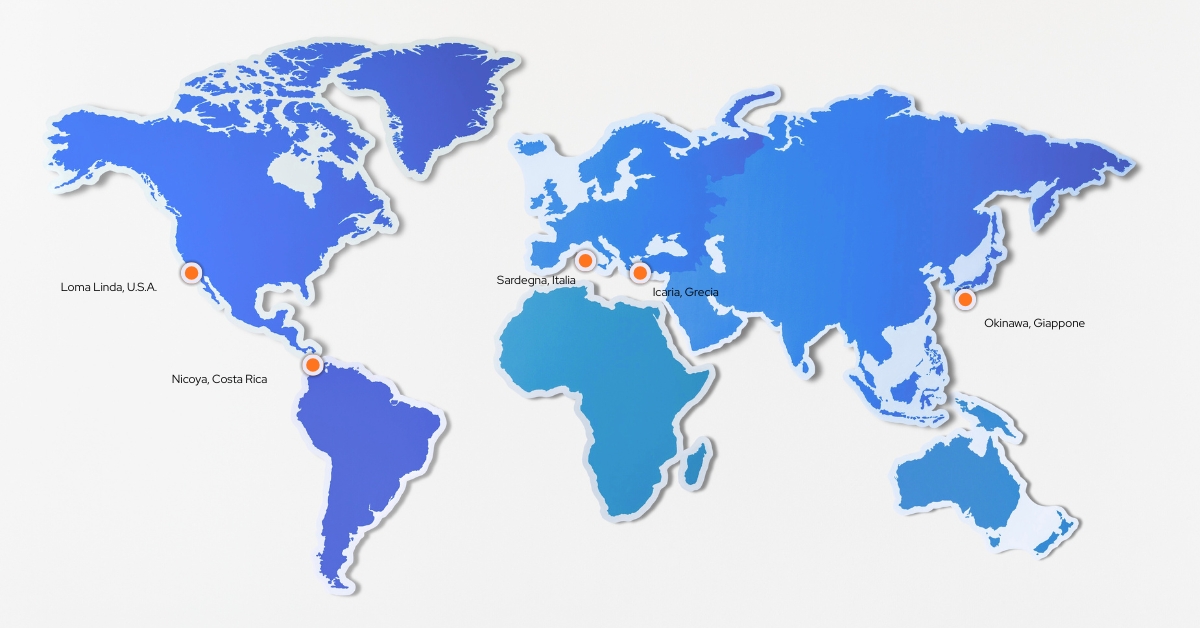 Sulle orme di Gianni Pes e Michel Poulain, i ricercatori che per primi hanno parlato di Zone Blu, andare a scoprire queste oasi di longevità è come fare un piccolo viaggio intorno al mondo. La più vicina a noi è proprio in Italia, più precisamente in Sardegna, ed è la regione dell’Ogliastra, i cui abitanti raggiungerebbero i cento anni di vita con straordinaria frequenza. La seconda è ancora nel bacino del Mediterraneo: si tratta dell’isola greca di Ikaria, nel Mar Egeo. Anche qui la speranza di vita è superiore alla media e si stima che quasi un abitante su tre tagli il traguardo dei novant’anni di età. Un’altra isola ospita il terzo gruppo umano di eccezionale longevità: per quanto l’intero Giappone sia storicamente tra i primi Paesi al mondo per aspettativa di vita, è la sola Okinawa a fregiarsi del titolo di Zona Blu. Alle tre isole si aggiunge la penisola di Nicoya, in Costa Rica, i cui abitanti, longevi e in buona salute, non cessano di raccontare le loro storie ai turisti che sbarcano sull’isola caraibica per ammirare i suoi meravigliosi paesaggi. In anni più recenti, il giornalista e scrittore Dan Buettner ha incluso tra le Zone Blu anche la comunità di Loma Linda, in California. Anche qui una dieta sana e uno stile di vita attivo permettono agli abitanti eccellenti risultati in termini di longevità e salute sul lungo periodo.